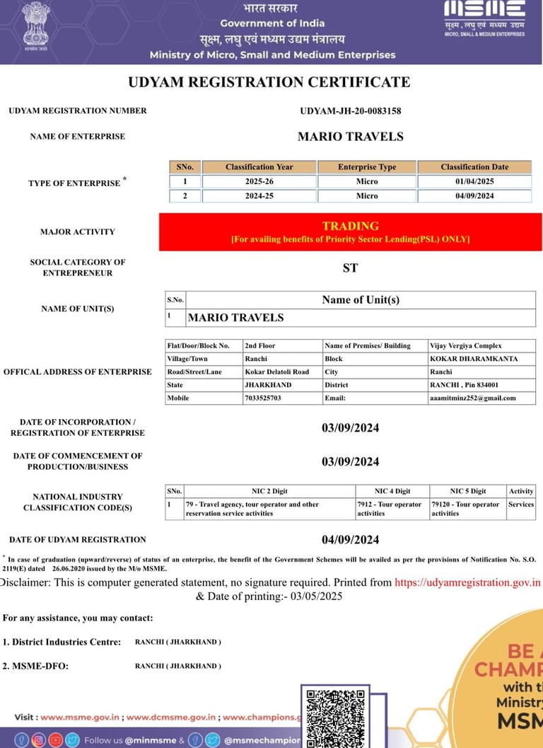 REGISTERED OFFICE : 2nd Floor , Vijayvergiya Complex , Dharamkanta , Delatoli Road , KOKAR RANCHI , Jharkhand , India